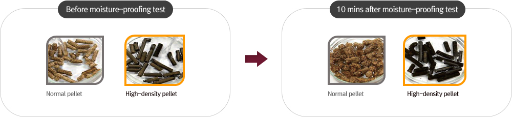 - There is almost no moisture absorption compared to normal pellets, contributing to possible reductions in transportation and storage costs with high energy density.