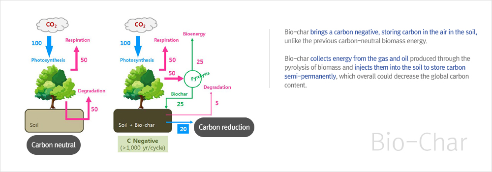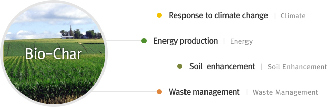 - Carbon dioxide in the air is fixed in the form of Bio-Char and returned to the soil, making the speed of the carbon cycle slow, controlling the emission of carbon dioxide for a long time, and reducing the emissions of methane and nitrous oxide, which have a bigger influence on climate change. (Using biomass as Bio-Char rather than energy could reduce the global carbon content by 20%.)