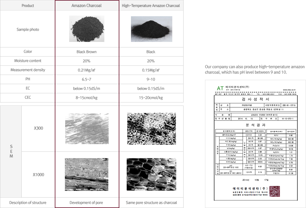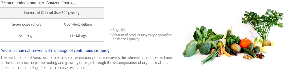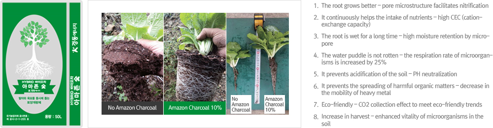 - Measures for soil-borne pests : Amazon charcoal stimulates assimilation via uprooting, growing, glossing of plant leaves, and increased thickness, and it raises environmental resistance against salinization, gas, and bad weather.