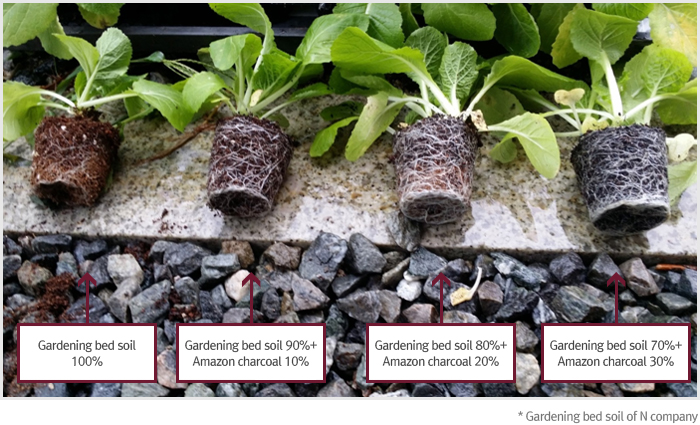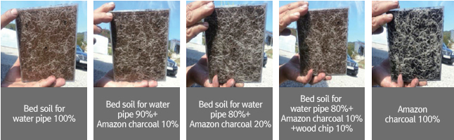 The growing condition of the roots is far better in the bed soil where Amazon charcoal 20~30% was added.