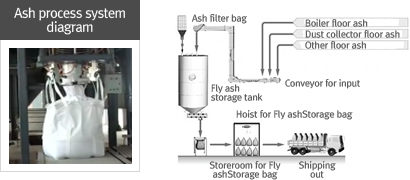 Ash generated after combustion is transferred by screw conveyor, collected en bloc, stored in the ash box (ton bag), and processed.